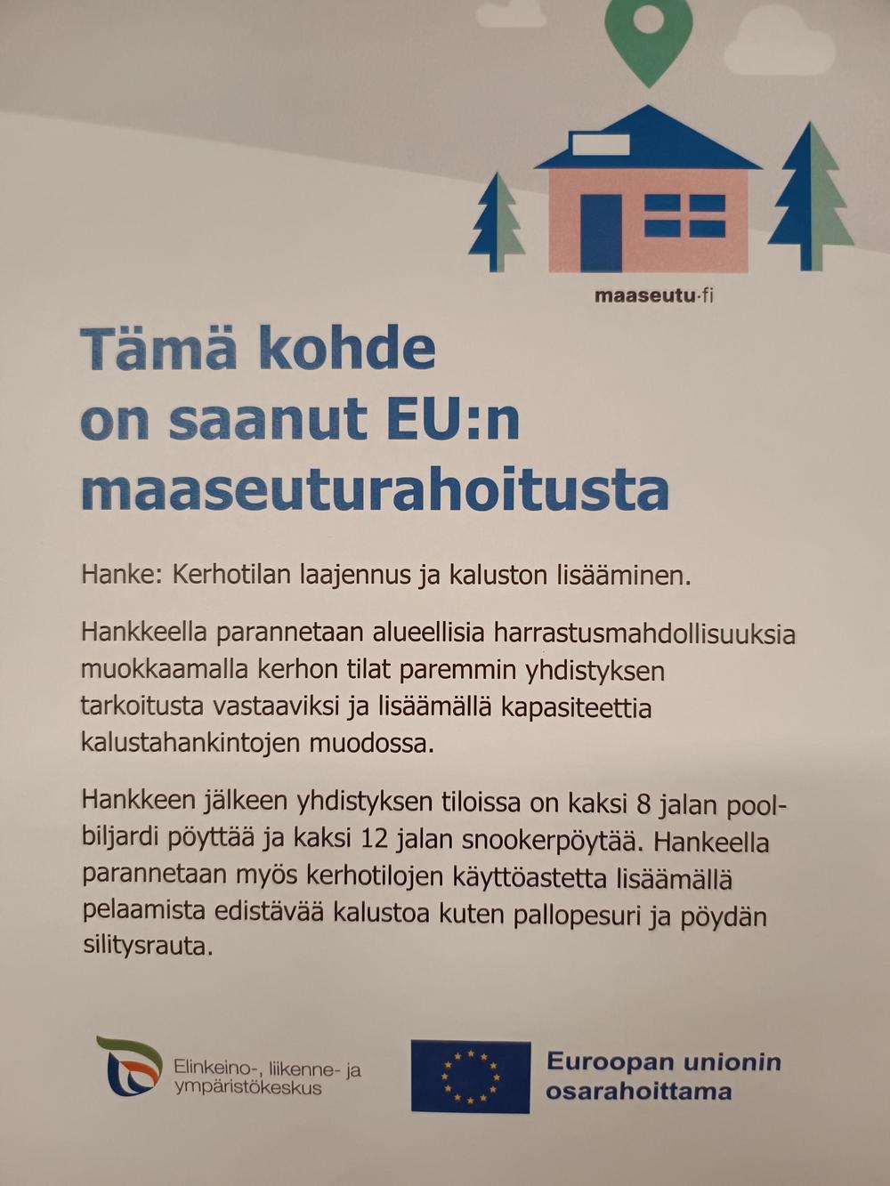 Keväällä tuli mahdolliseksi toisen Snooker-pöydän hankinta vaikka tilojen silloiset pohja ratkaisut eivät olleet siihen suotuisat. Ratkaisu vaihtoehdoksi keksittiin entisen aula-tilan yhdistäminen vanhaan pelitilaan. Tämä puolestaan vaikutti projektiin siten että siihen vaadittava taloudellinen panostus nousi kohtuuttoman suureksi pelkästään jäseniltä kerättävällä rahoituksella. Aiemmin olimme kuulleet vastaavien yhdistysten remontoineen tilojaan ja uusineen kalustoaan Leader-tuella. Tästä rohkaistuneena otimme yhteyttä Vaara-Karjalan Leader Ry:hyn ja rupesimme selvittämään mahdollisuuksia saada tukea hankkeeseemme.